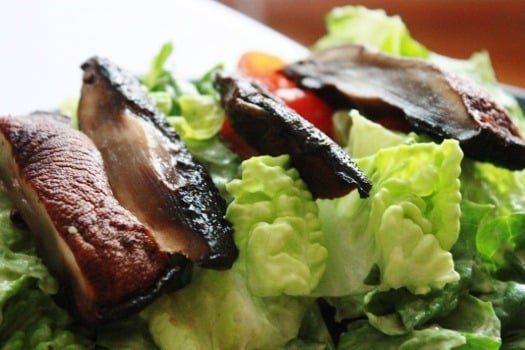 Serve over crisp romaine. I topped my salad with some marinated portobello and cherry tomatoes!